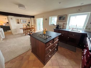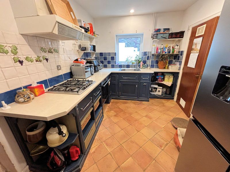 2 windows to front, tiled floor to kitchen area, oak units, polished slate work top, inset ceramic sink, integral dishwasher, gas fired Aga with extractor over, gas hob, part tiled walls, door to;