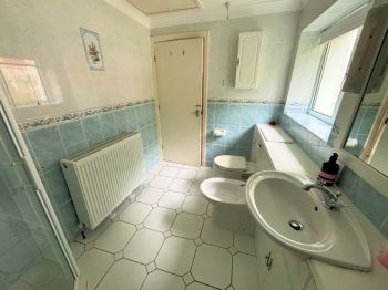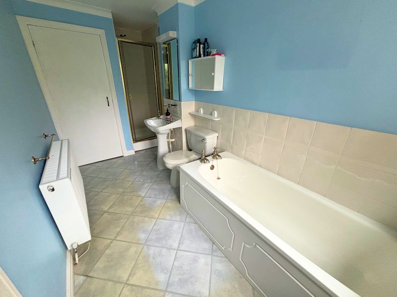 Window to side, vinyl floor, bath, wash basin, w c, tiled shower cubicle, built in airing cupboard.