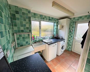 Window to side, half glazed door to rear, laminate work top, Belfast sink, plumbed for washing machine and dishwasher, Worcester boiler located here, tiled walls and floor, door to: