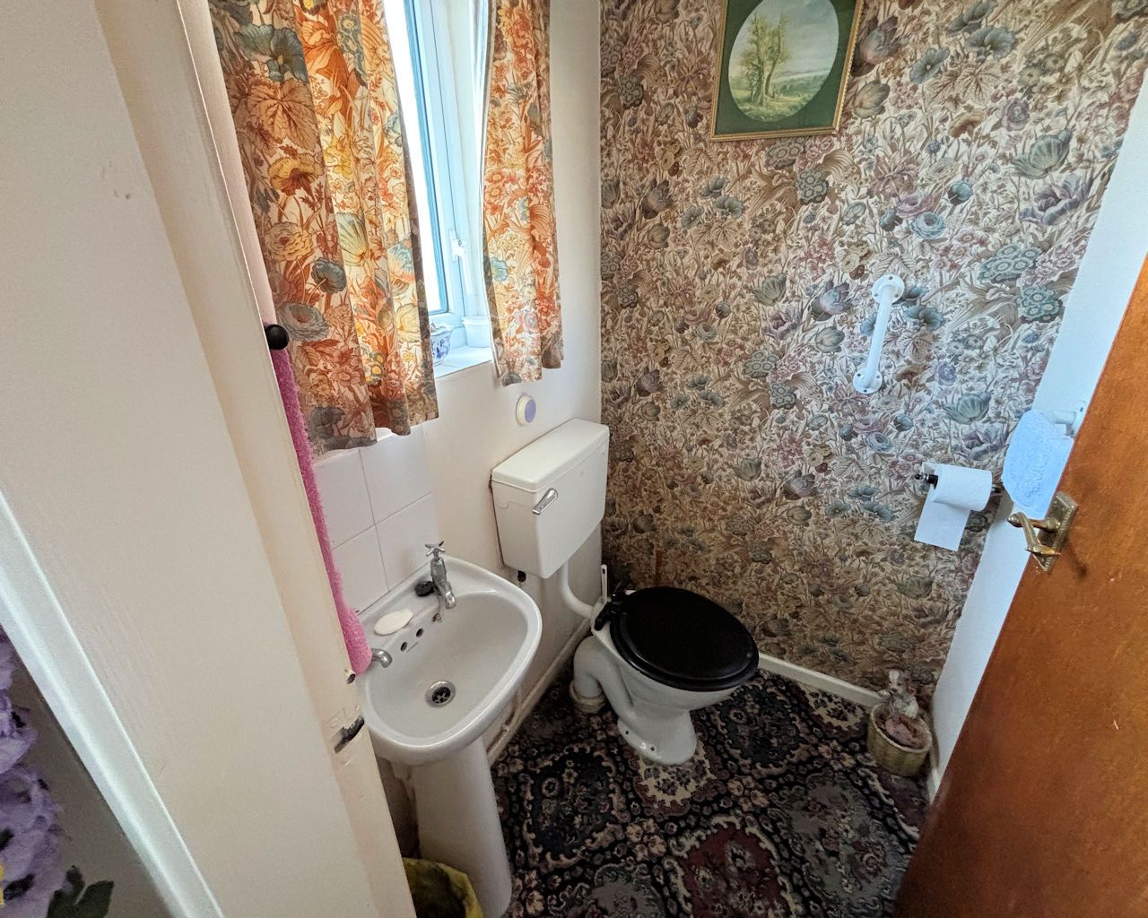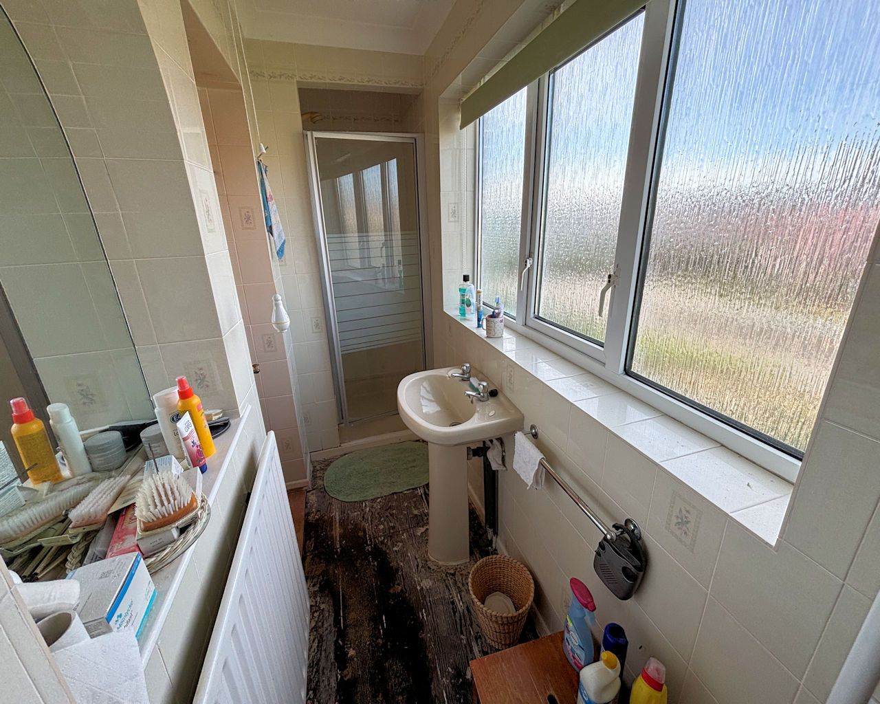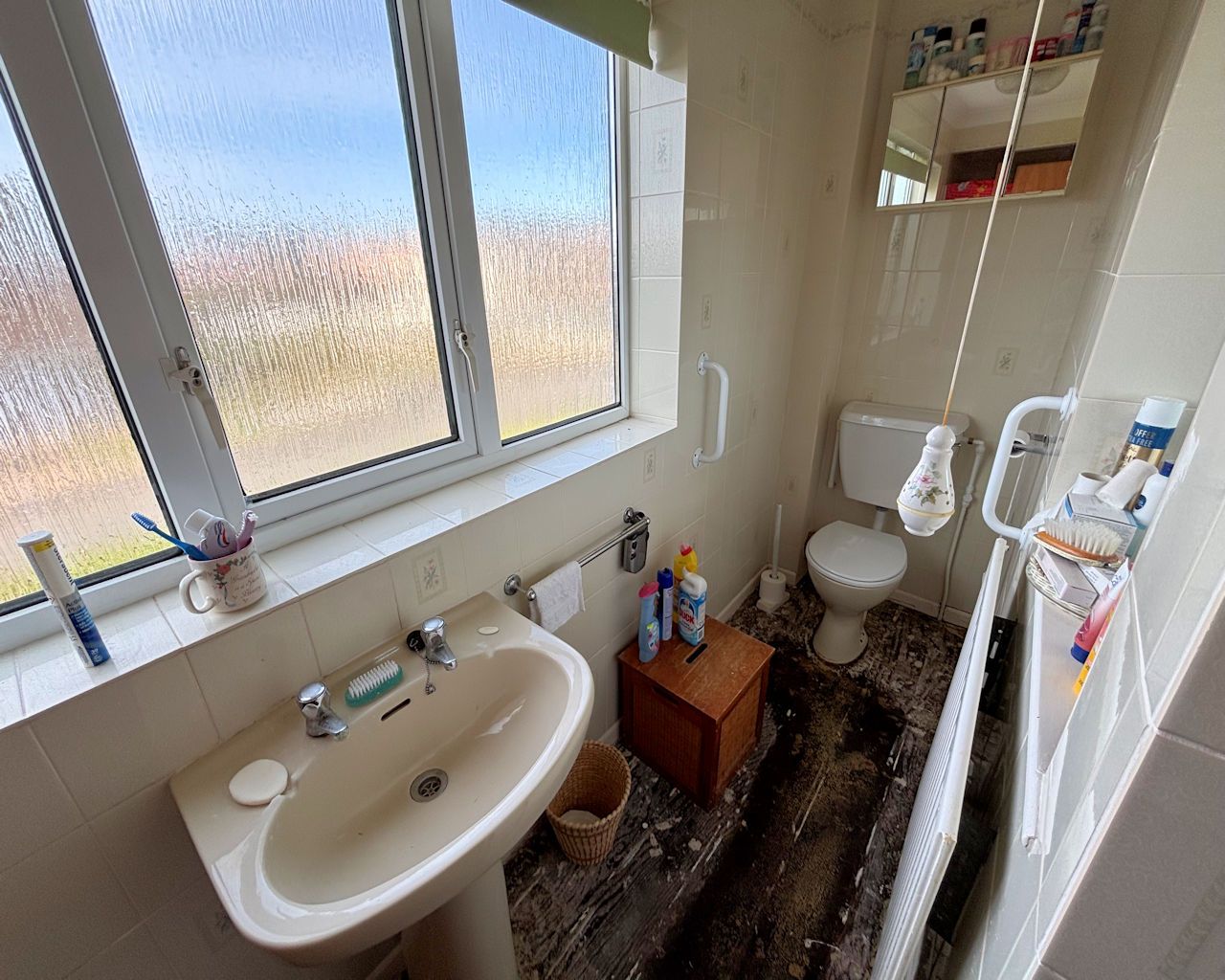 Window to rear, bath, wash basin, w c, shower cubicle, built in airing cupboard housing hot water cylinder and slatted shelving, tiled walls.