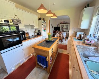 Window, cream units, laminate work top, stainless steel sink and drainer, induction hob, eye level oven and grill, led plinth lighting, plumbing for washing machine and slim line dishwasher, cushioned vinyl floor, part tiled walls, Potterton boiler and consumer unit located here.