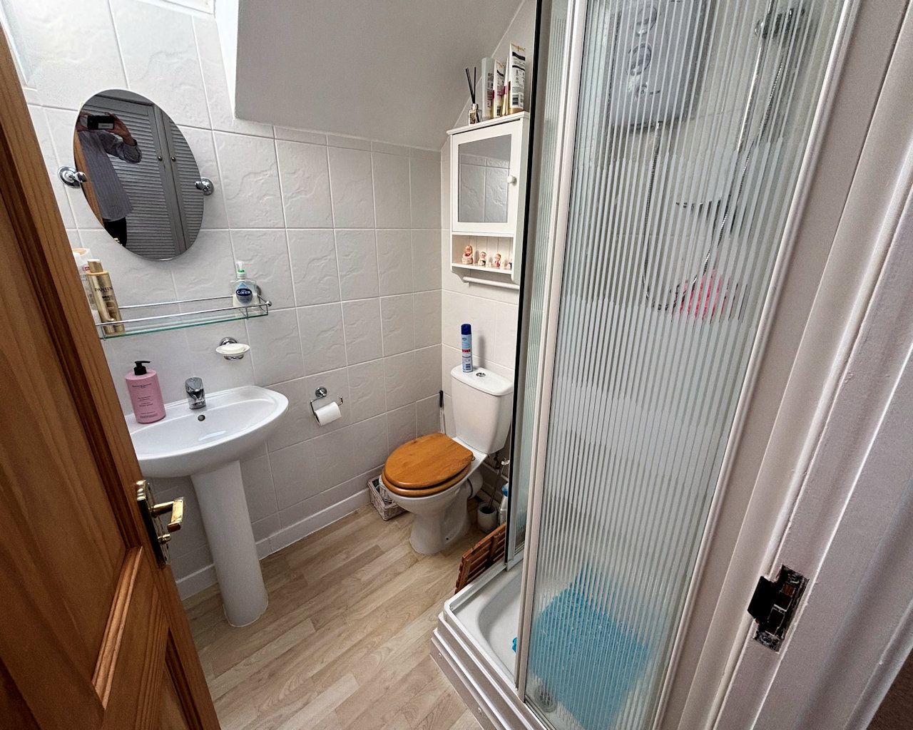 Skylight, w c, wash basin, shower cubicle, tiled walls, cushioned vinyl floor, heated towel rail, small loft access.