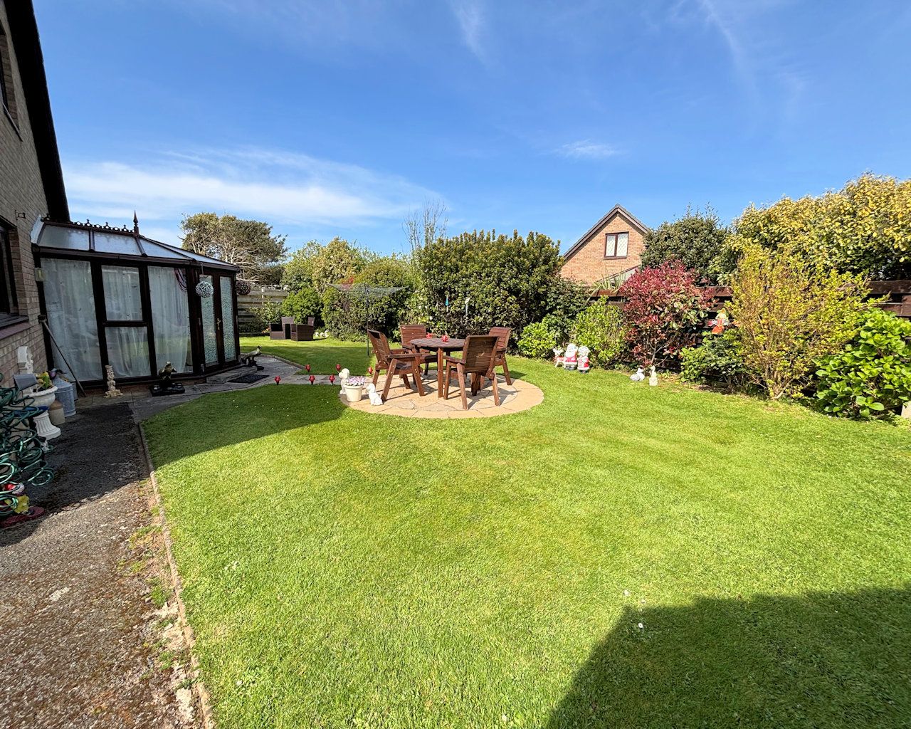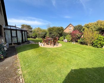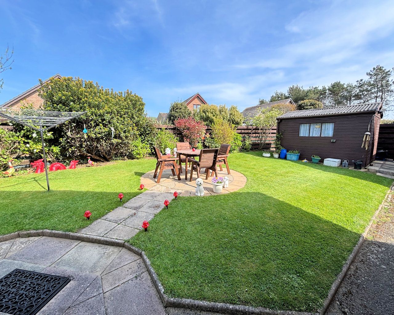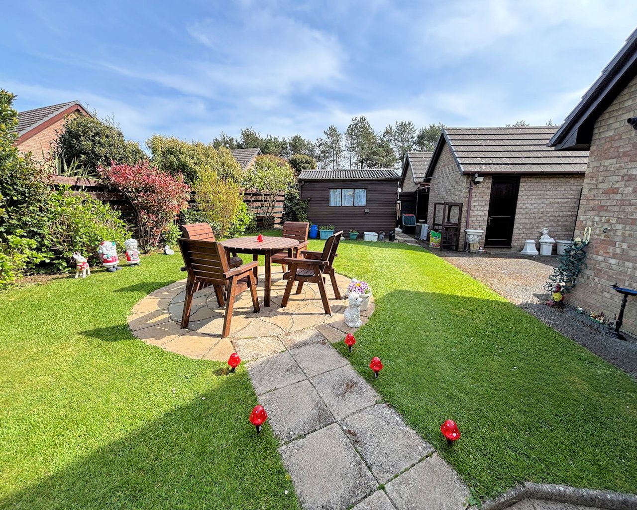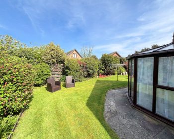 Enclosed with mature planting, laid to lawn, garden shed, access to rear storage shed and garage, outside tap and lighting.