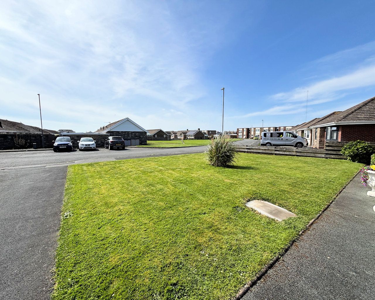Open plan lawn, gated access to rear, access to garage and storage shed, tarmac parking for several vehicles.
