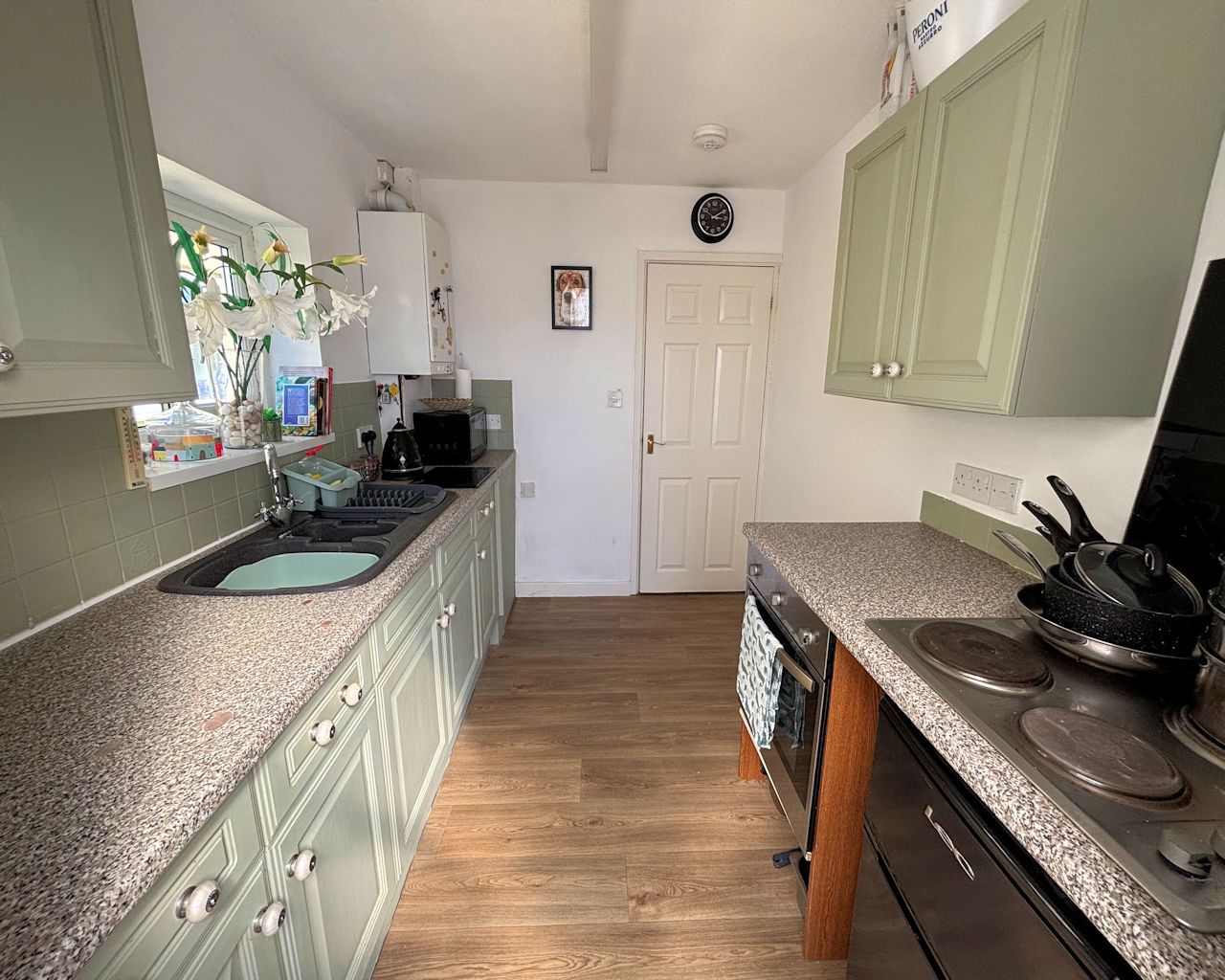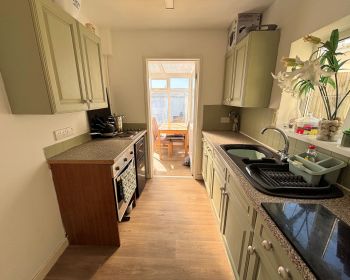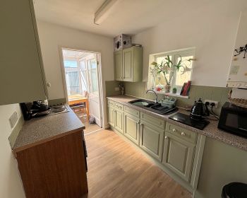 Window to side, glazed door to rear with access to conservatory, base and wall units, laminate work top, composite sink and drainer, built in oven, electric hob,part tiled walls, vinyl floor, boiler located here.