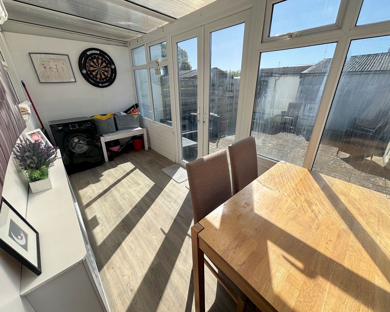 Windows and French doors to rear, poly carbonate roof, vinyl floor, plumbed for washing machine.