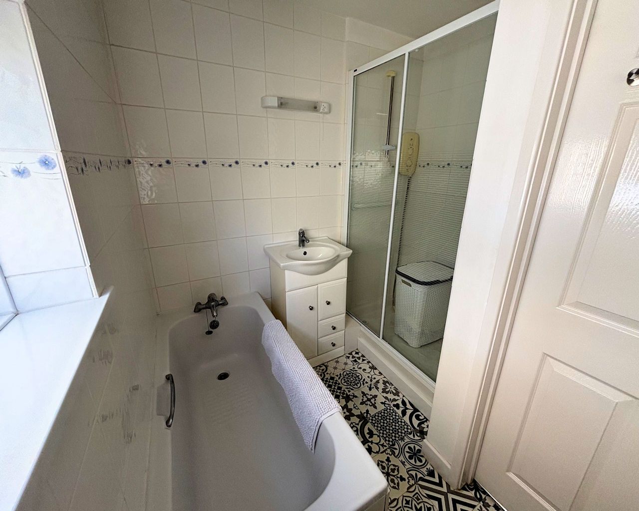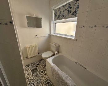 Window to side, vinyl floor, part tiled walls, vanity wash basin, w c, bath, tiled shower cubicle with electric shower, extractor light.