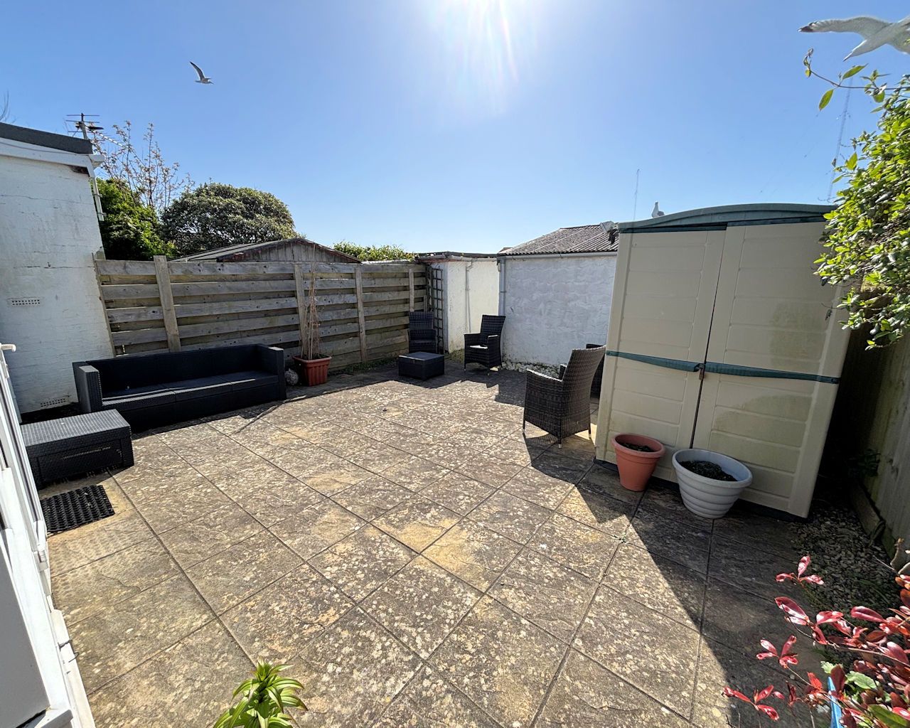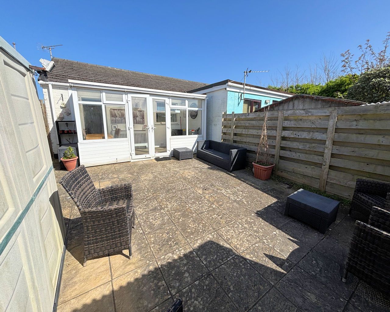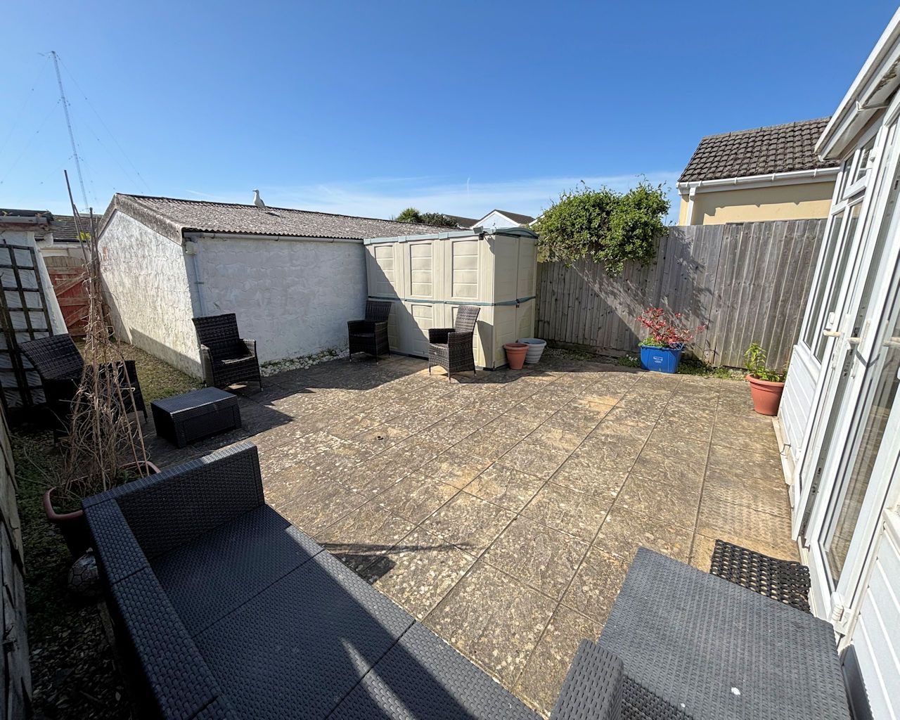Fully enclosed and paved, small shed, gate to rear.