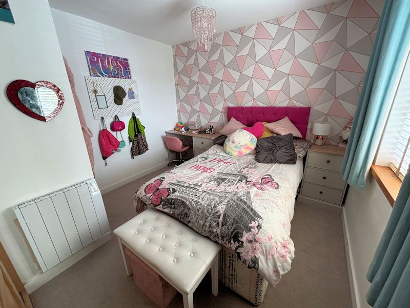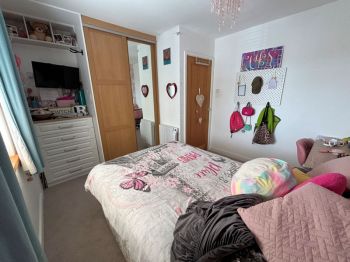 Window to front, wall mounted heater, fitted wardrobe with mirrored door and drawer unit.