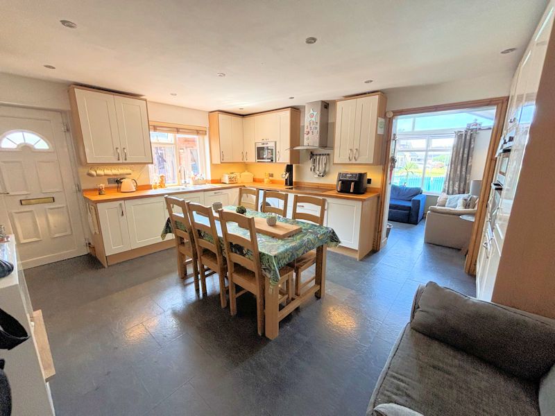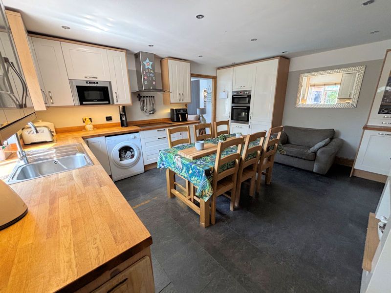 Window to front, white gloss units, oak work top, stainless steel sink and drainer, plumbed for washing machine, integral dishwasher;larder fridge and freezer, 5 ring ceramic hob with filter over, eye level double oven and grill, laminate floor tiles with electric under floor heating, open to: