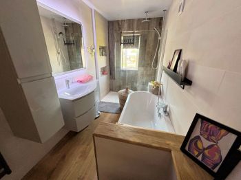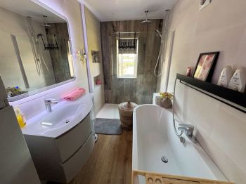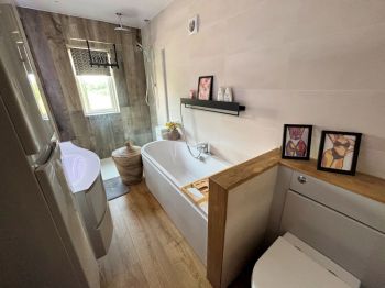 Window to side, tiled walls and floor, vanity wash basin, double ended bath with shower head handset, w c, large walk in cubicle with Mira sport pump shower, shower head handset and water fall shower, inset shelving, extractor, heated towel rail.
