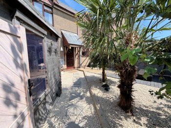 Fully enclosed with 2 gated entrances to front and side, timber workshop 5m x 3m with separate storage cupboard both with power, low maintenance gravel and decked garden area with mature trees, 3 external power points - 1 specifically for hot tub use, outside tap. Non designated parking.