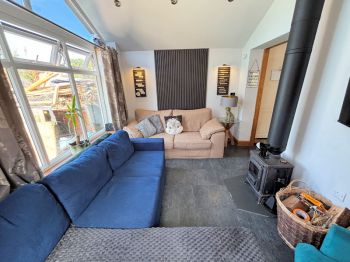 French doors to front, picture window to side, vaulted ceiling, multi fuel stove, laminate floor tiles with electric under floor heating.