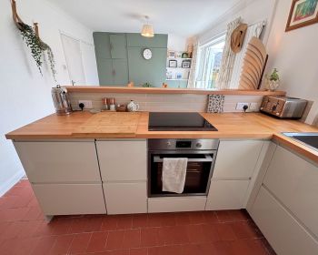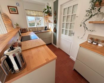 Window and French doors to side, built in recessed cupboards, base and wall units with hidden drawers, woodblock work top, stainless steel sink and drainer, induction hob, built in oven, integral fridge, tiled floor, part tiled walls, extractor, door to: