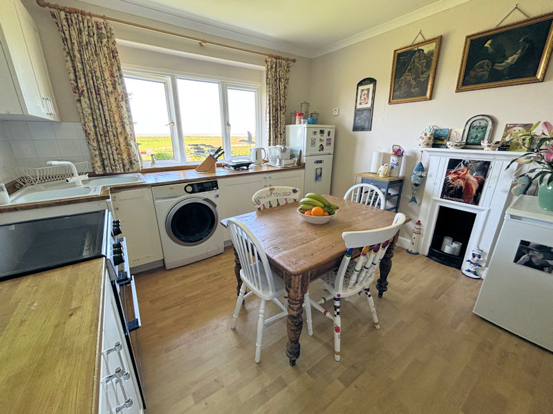 Window to front with distant sea views, laminate floor, white units, wood block work top, double enamel sink, plumbed for washing machine, electric cooker point, original cast iron fireplace.