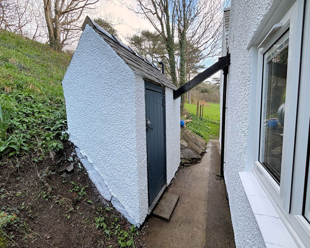 Enclosed garden with gated access, laid to lawn with mature hedging and trees and recently planted fruit trees. Small patio, rear brick built and rendered shed housing Worcester boiler, timber shed, tap, lighting, oil tank, septic tank is located in the lower end of the front garden, the soak-away is in the field to the left.