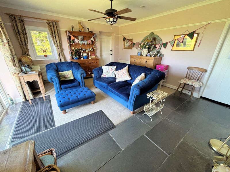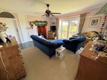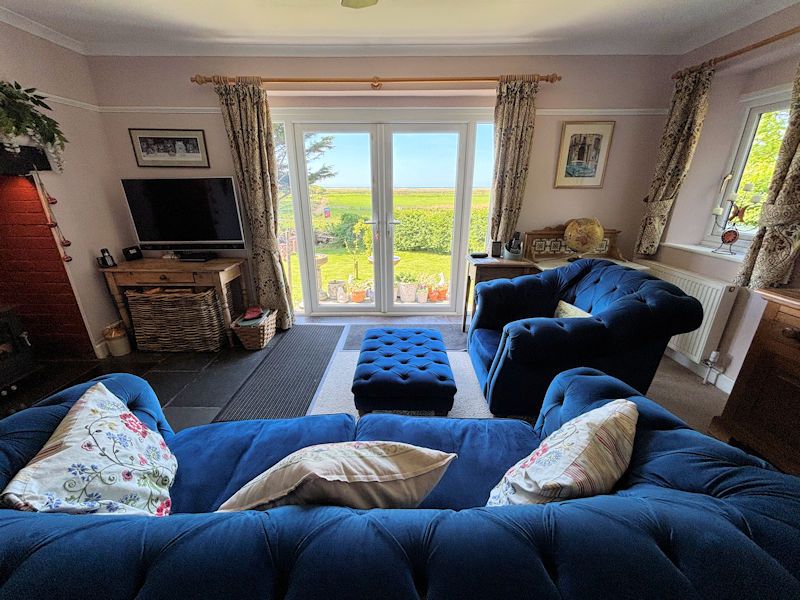 Window to side, French doors to front with distant sea views, built in cupboards, original fireplace with wood burning stove (installed 2023), part timber ( under carpet) part slate flooring, door to;