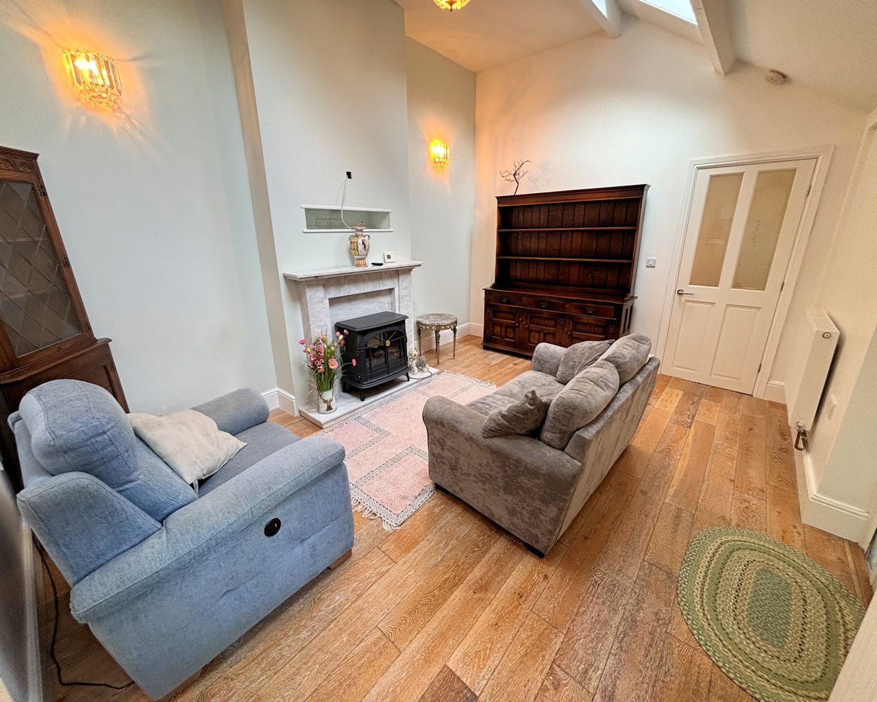 Window and 2 skylights to front, tiled floor, composite decorative fireplace, step up to