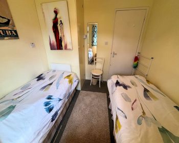 Window to front with pleasant views over the park to the hills beyond, part panelled walls, wall mounted heater.