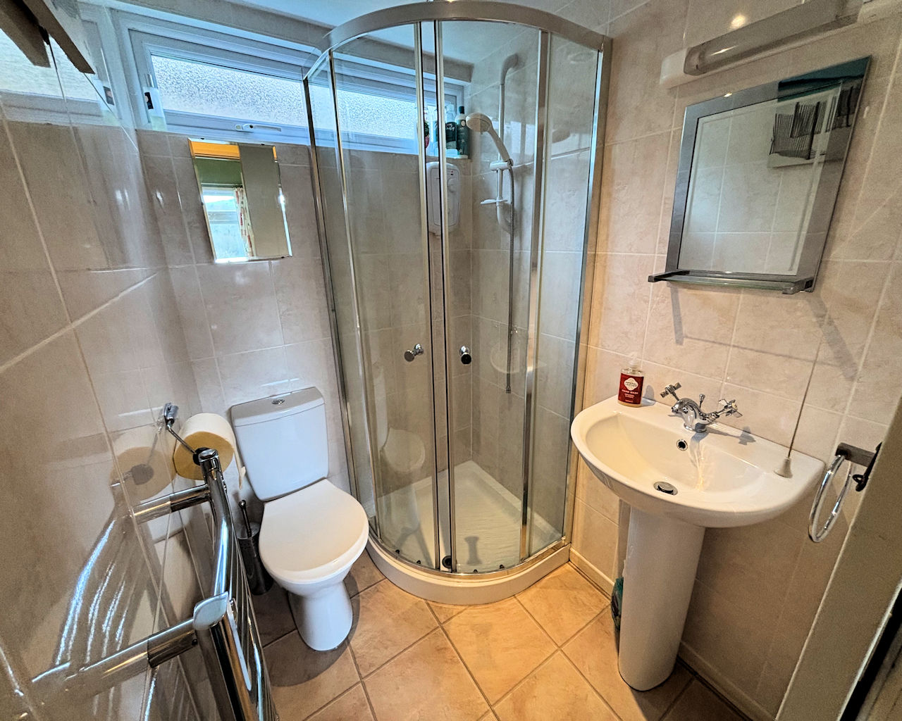 Window to rear, tiled walls and floor, shower cubicle with electric shower, wash basin, w c, extractor light.