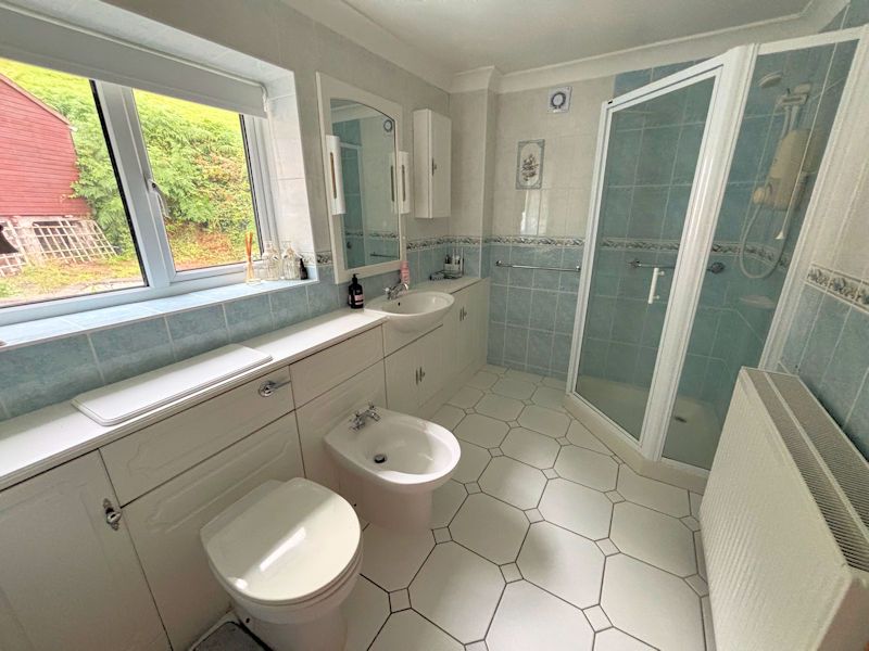 Window to rear, vanity wash basin,w c and bidet, corner shower cubicle, tiled floor and walls, extractor, access to loft with pull down ladder.