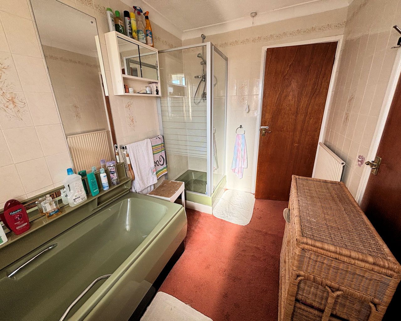 Window to rear, bath, wash basin, w c, shower cubicle, built in airing cupboard housing hot water cylinder and slatted shelving, tiled walls.
