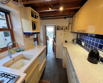Glazed door to front, slate tiled floor, built in cupboard housing electric meter and consumer unit, beamed ceiling, original cast iron fireplace in working order, open to:.