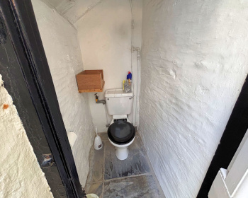 Storage cupboard beneath the cottage and slate terrace with rooms for bins, shared slate steps to slate paved terrace leading to a side and rear garden area paved and decked with mature shrubs, vegetable bed and shed, small lawn, storage cupboard, slate steps down to external toilet and access to kitchen door.