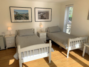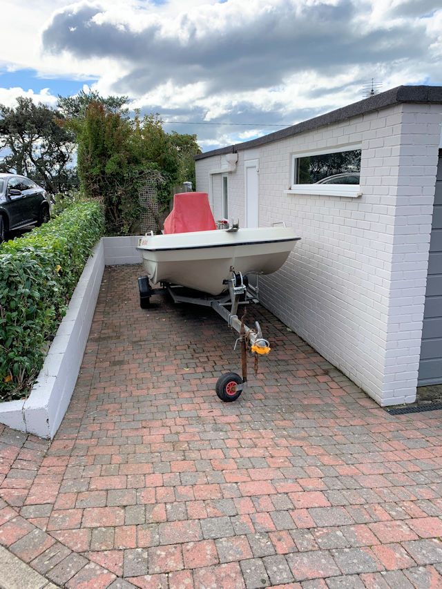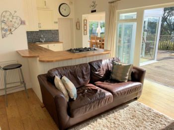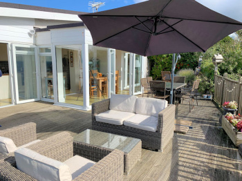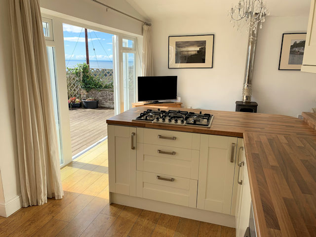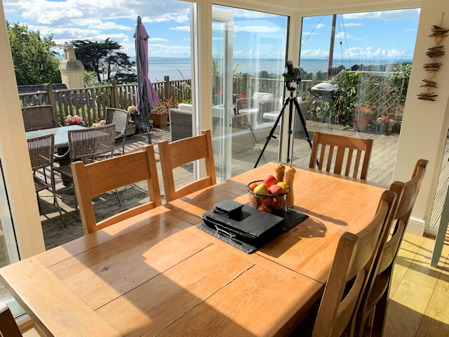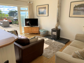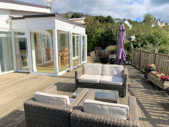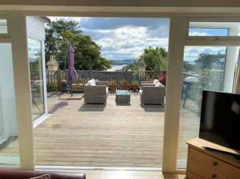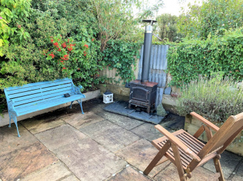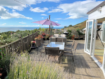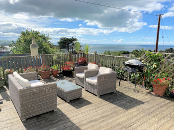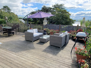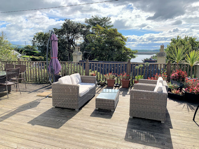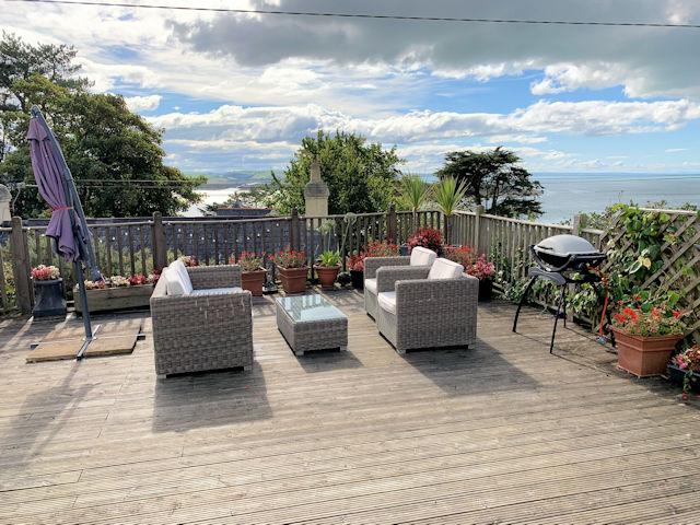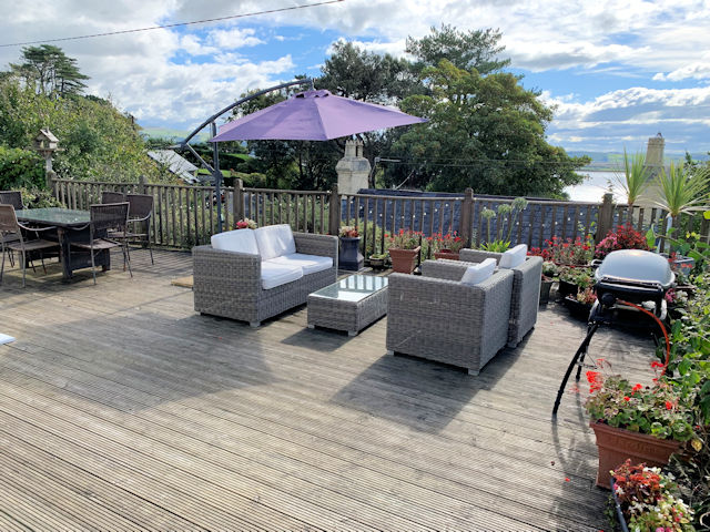 Fully enclosed south facing decked garden with panoramic estuary and part village/hillside views, small paved area with external wood burning stove, raised bed with mature planting, lighting, tap?