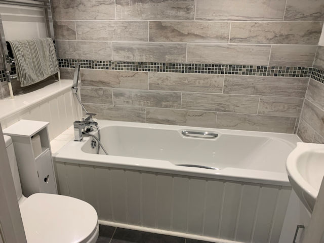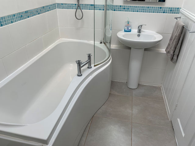 Skylight, wash basin with led mirror over, w c, P shaped bath with glass screen and shower over, part tiled walls, tiled floor, heated towel rail, extractor, built-in cupboard housing Worcester boiler.