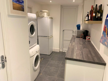 Door to side, tiled floor, base units, laminate work top, plumbed for washing machine, door to;