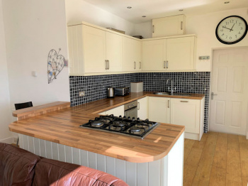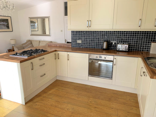 Laminate breakfast bar, cream Shaker style units, stainless steel sink and drainer, integral fridge and dishwasher, built-in oven, 5 ring gas hob, tiled walls. Built-n cupboard housing consumer unit. Open to;