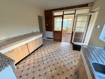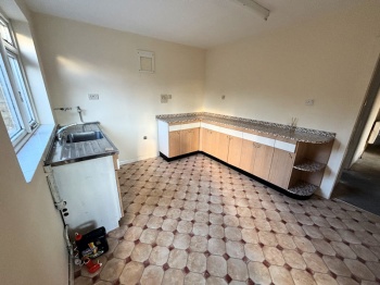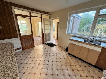 Wood window to side,original 1960s retro work tops and drawers, laminate work top, stainless steel sink and double drainer, electric cooker point, vinyl floor, wall mounted heater, glazed door to side lobby, glazed door to;