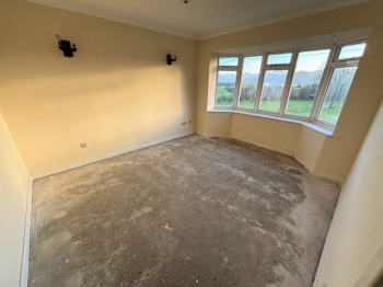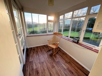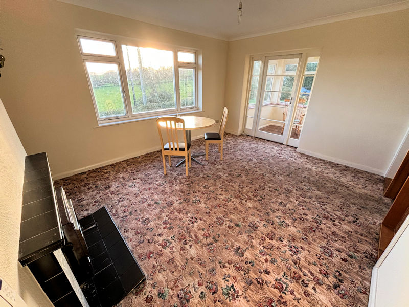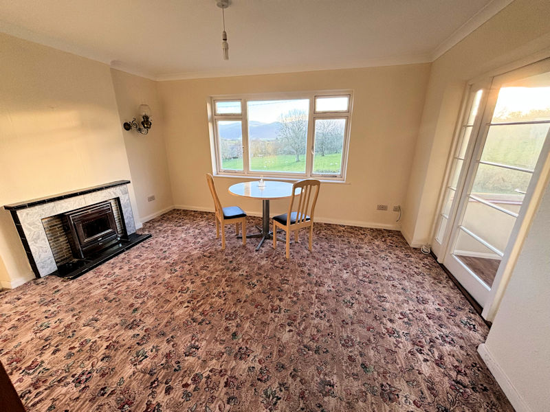 Wood window to front with far-reaching views, tiled fireplace with inset multi fuel stove, wall mounted heater, glazed door to,