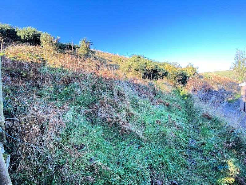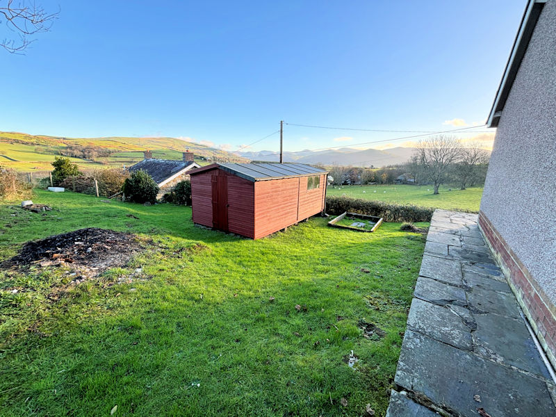 Fully enclosed grounds with gated entrance, tarmac driveway and parking for several vehicles, paved area front and rear, shed, lawn area with mature shrubs at the front and rear hillside with public footpath running through it.