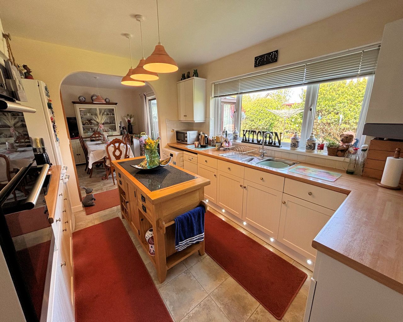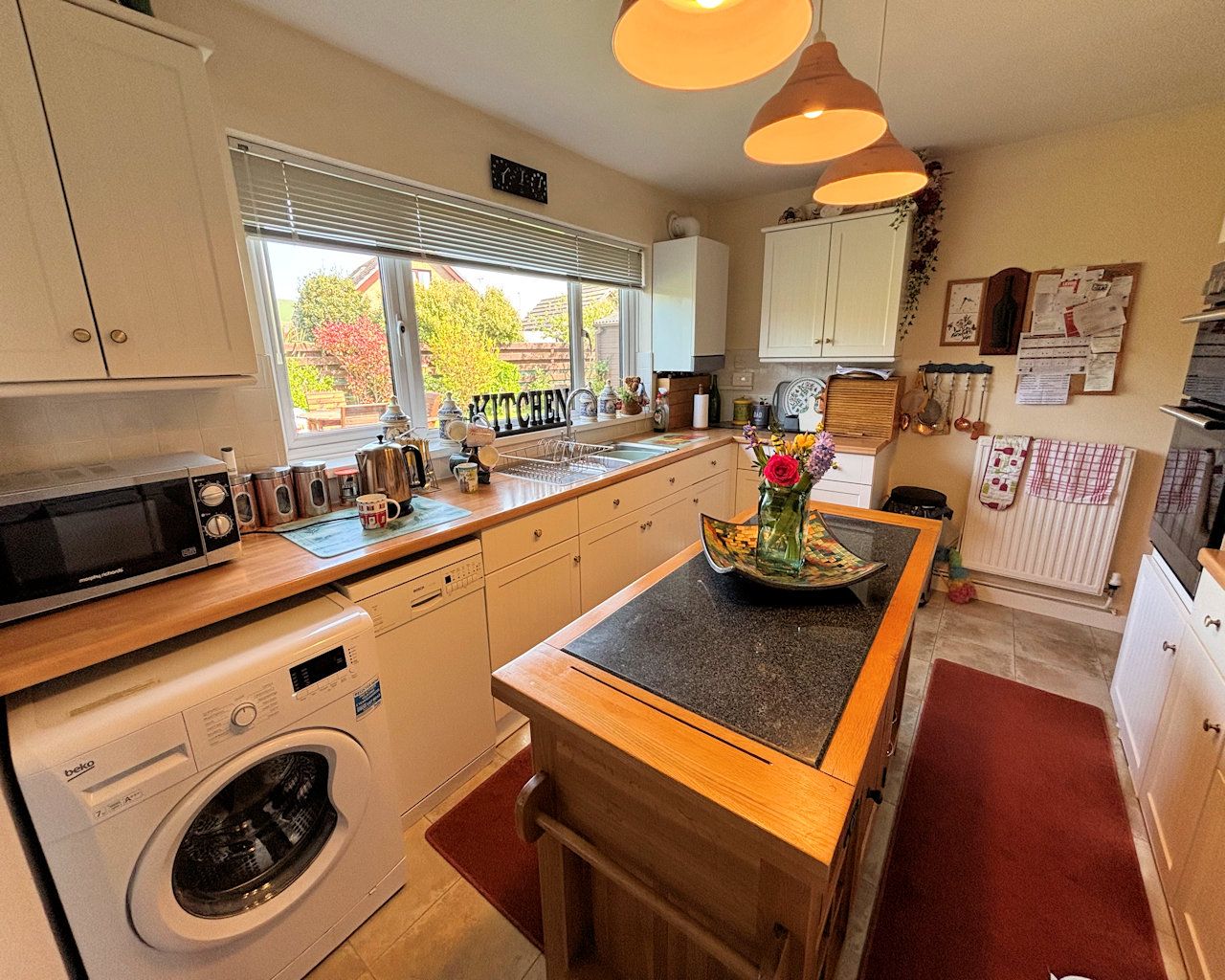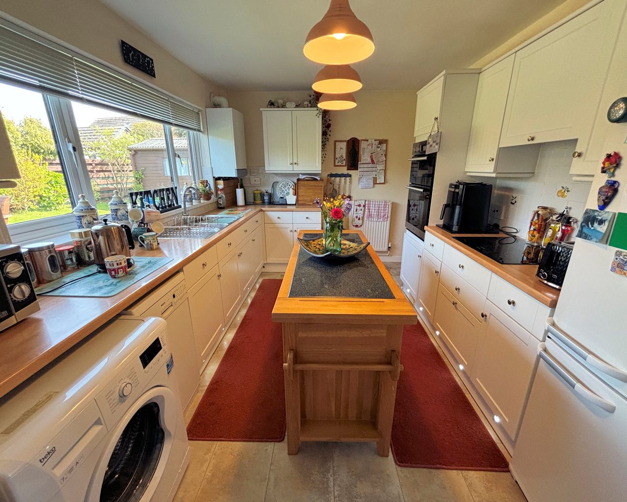 Window, cream units, laminate work top, stainless steel sink and drainer, induction hob, eye level oven and grill, led plinth lighting, plumbing for washing machine and slim line dishwasher, cushioned vinyl floor, part tiled walls, Potterton boiler and consumer unit located here.