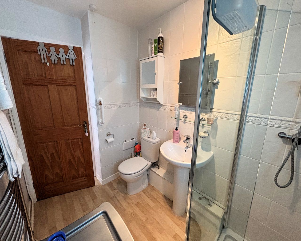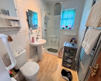 Window to side, cushioned vinyl floor, tiled walls, wash basin, w c, walk in cubicle with glass screen, heated towel rail.