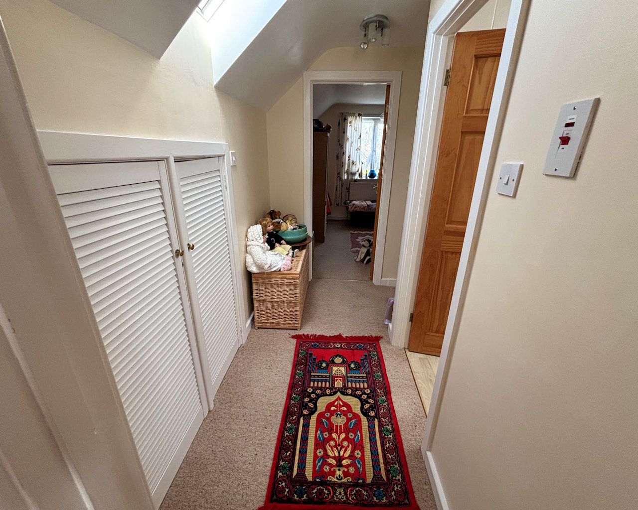 Skylight, built in under eaves airing cupboard with shelving.