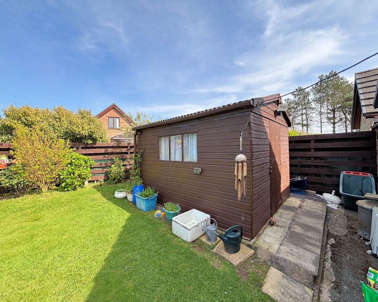 Enclosed with mature planting, laid to lawn, garden shed, access to rear storage shed and garage, outside tap and lighting.
