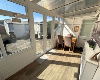 Windows and French doors to rear, poly carbonate roof, vinyl floor, plumbed for washing machine.