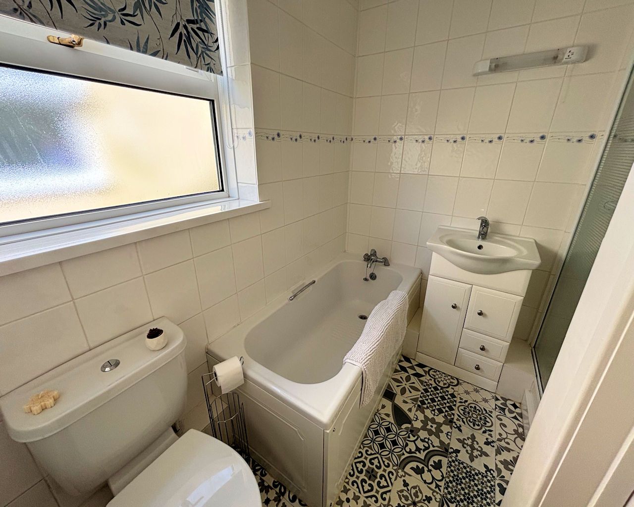 Window to side, vinyl floor, part tiled walls, vanity wash basin, w c, bath, tiled shower cubicle with electric shower, extractor light.