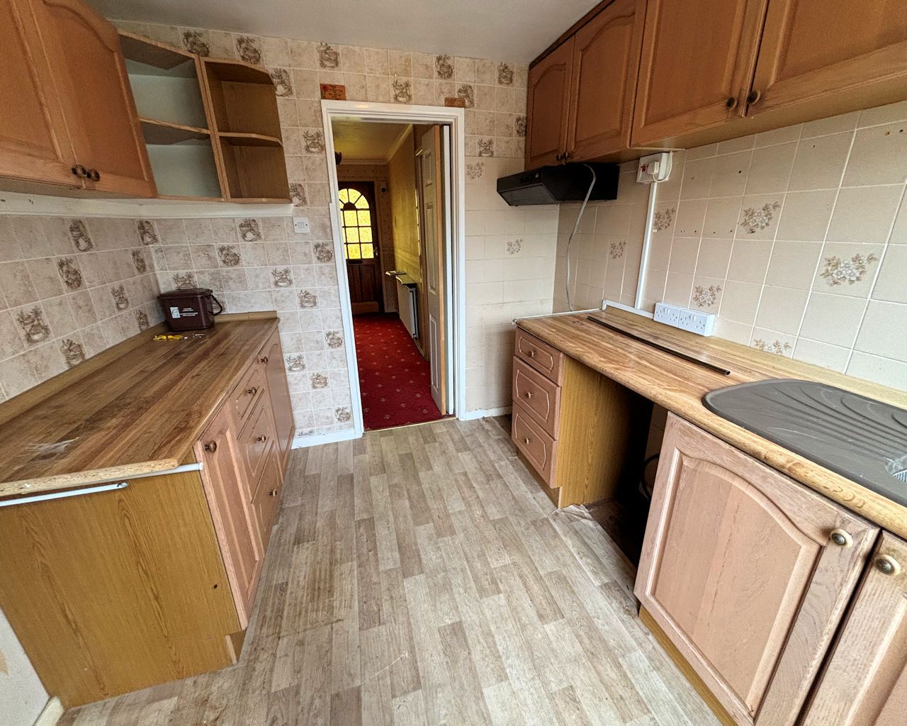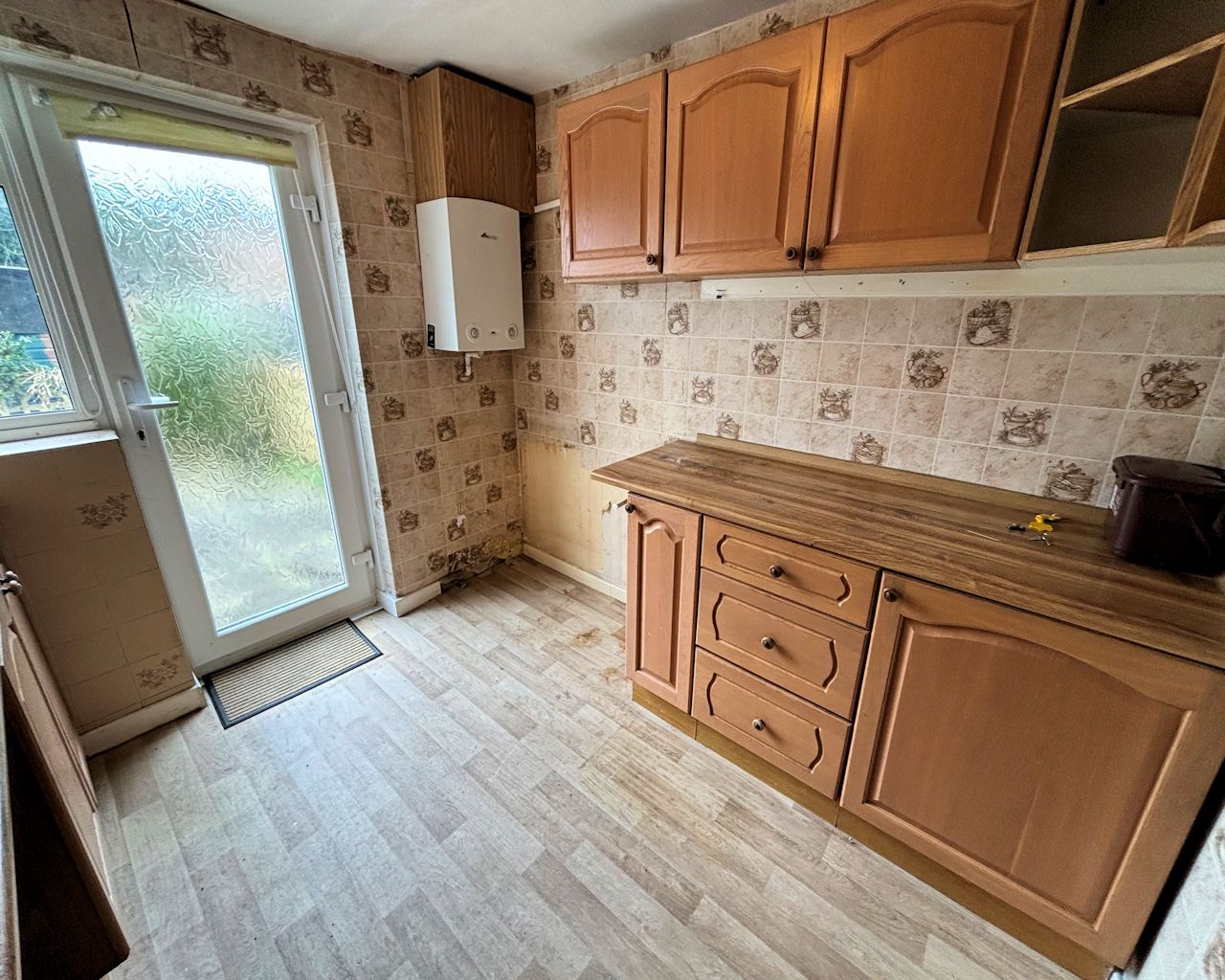 Window and half glazed door to rear, base and wall units, laminate work top, composite sink and drainer, plumbed for washing machine, vinyl floor, part tiled walls, Worcester boiler located here.