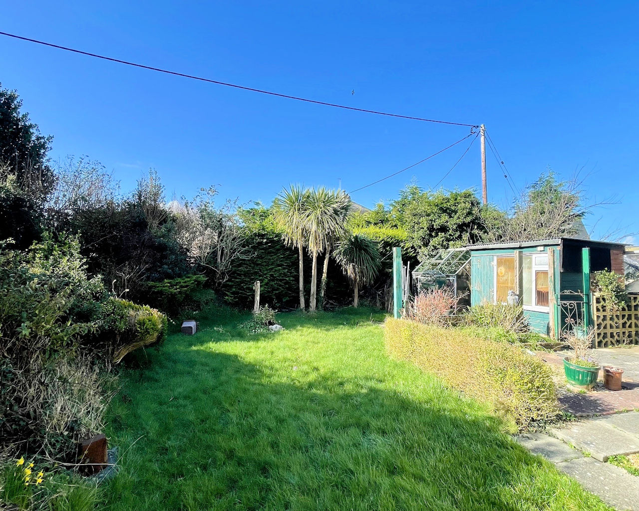Fully enclosed with mature planting, paved patio, lawn, greenhouse and small shed.