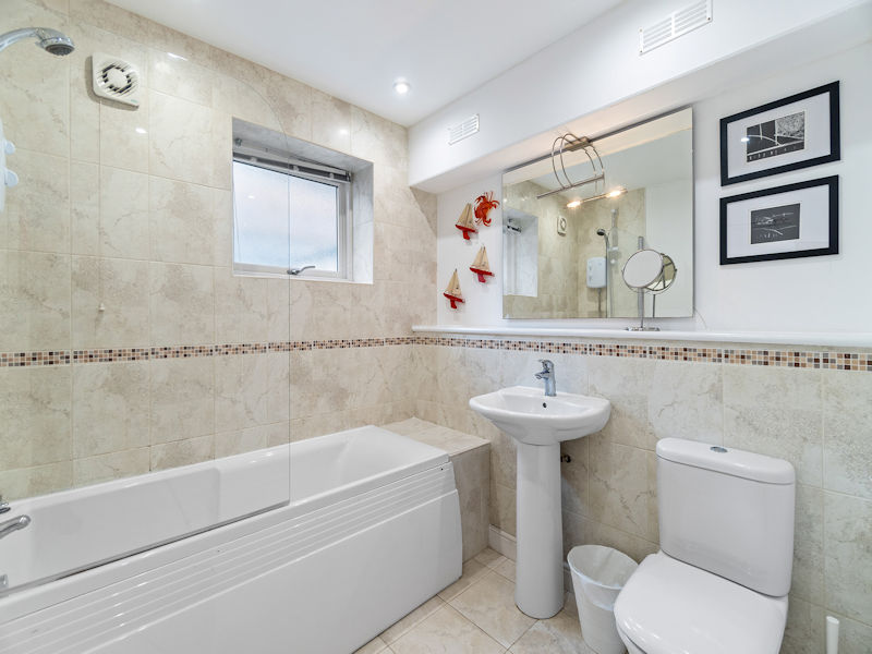 Window to rear, tiled floor, part tiled walls, bath with electric shower over and glass screen, wash basin, w c, built in cupboard housing Glowworm com-bi boiler, extractor.