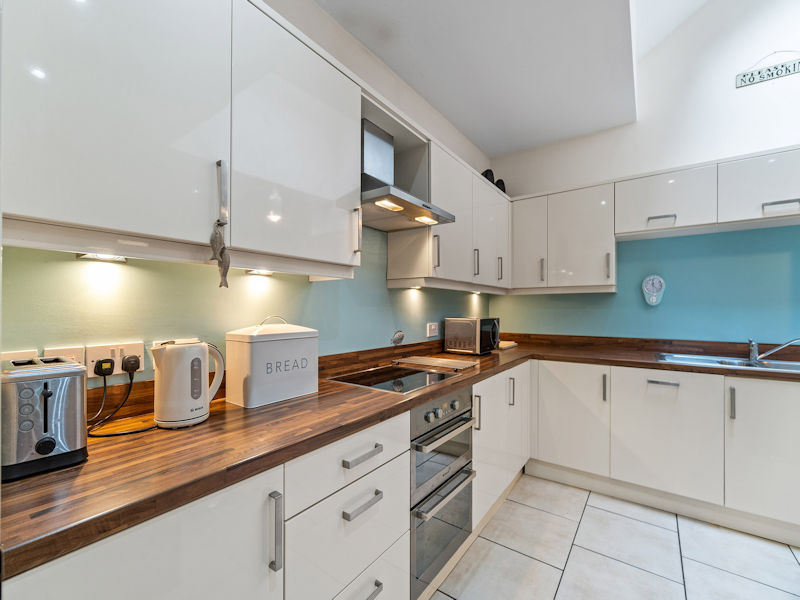 Skylight to rear, tiled floor, cream units, wood effect work top, stainless steel sink and drainer, built in oven and grill with extractor over, ceramic hob, integral dishwasher; washer/drier and larder fridge/freezer.