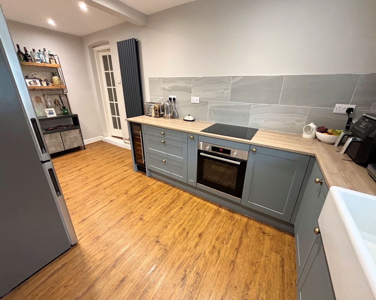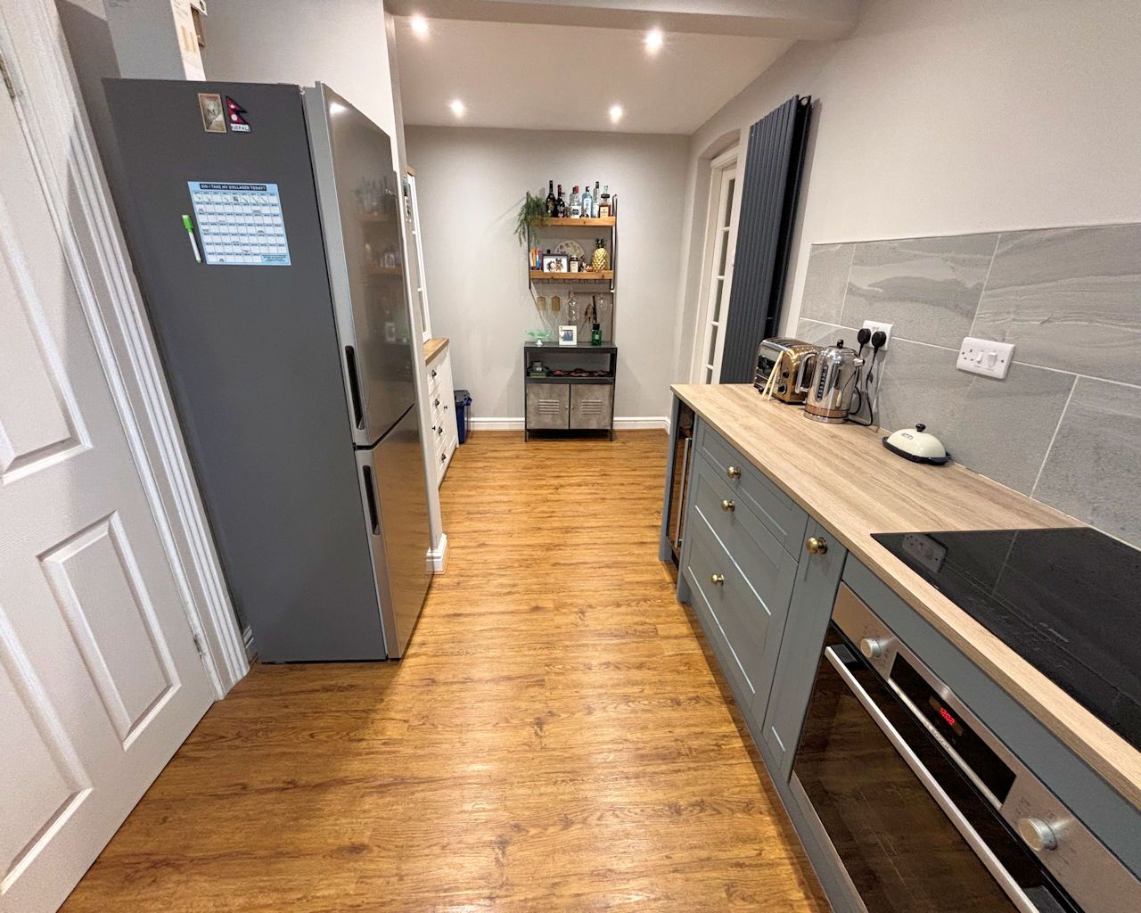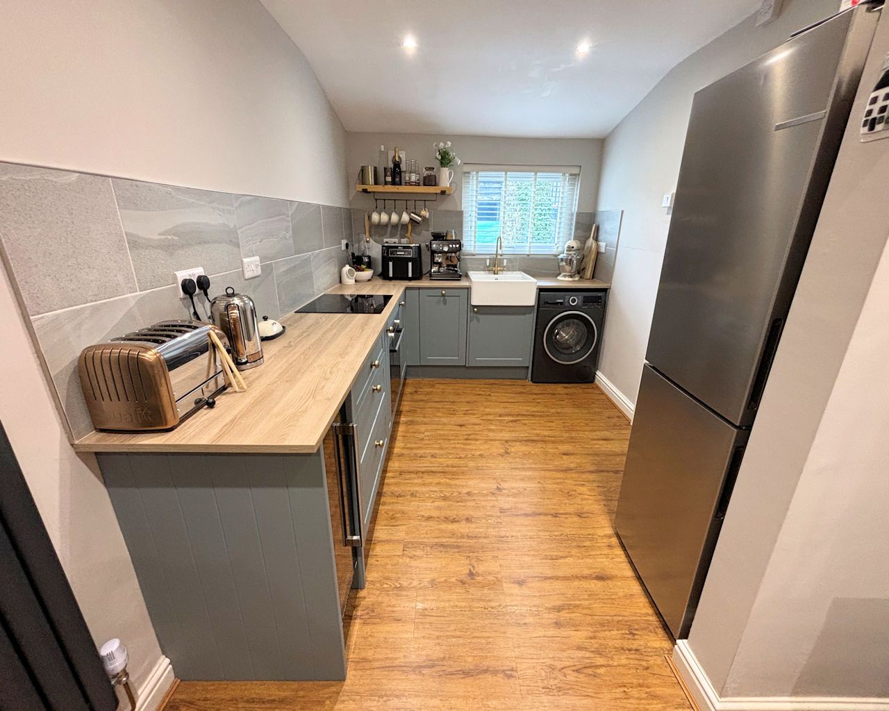 KITCHEN 5.15 x 2.44 Window to side, LVT flooring, base units, laminate work top, ceramic sink, Bosch induction hob and built in oven, plumbing for washing machine, integral wine fridge, part tiled walls, extractor, door to: